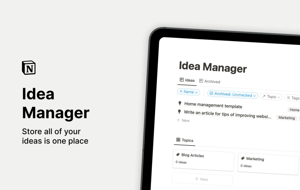 Use Notion Idea Manager to store all your ideas in one place. Write, organize and revisit in a matter of clicks.